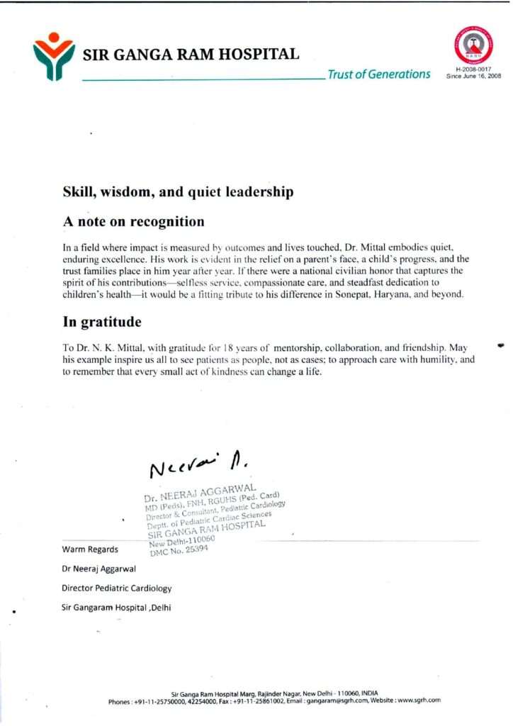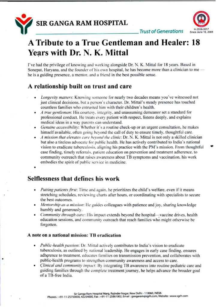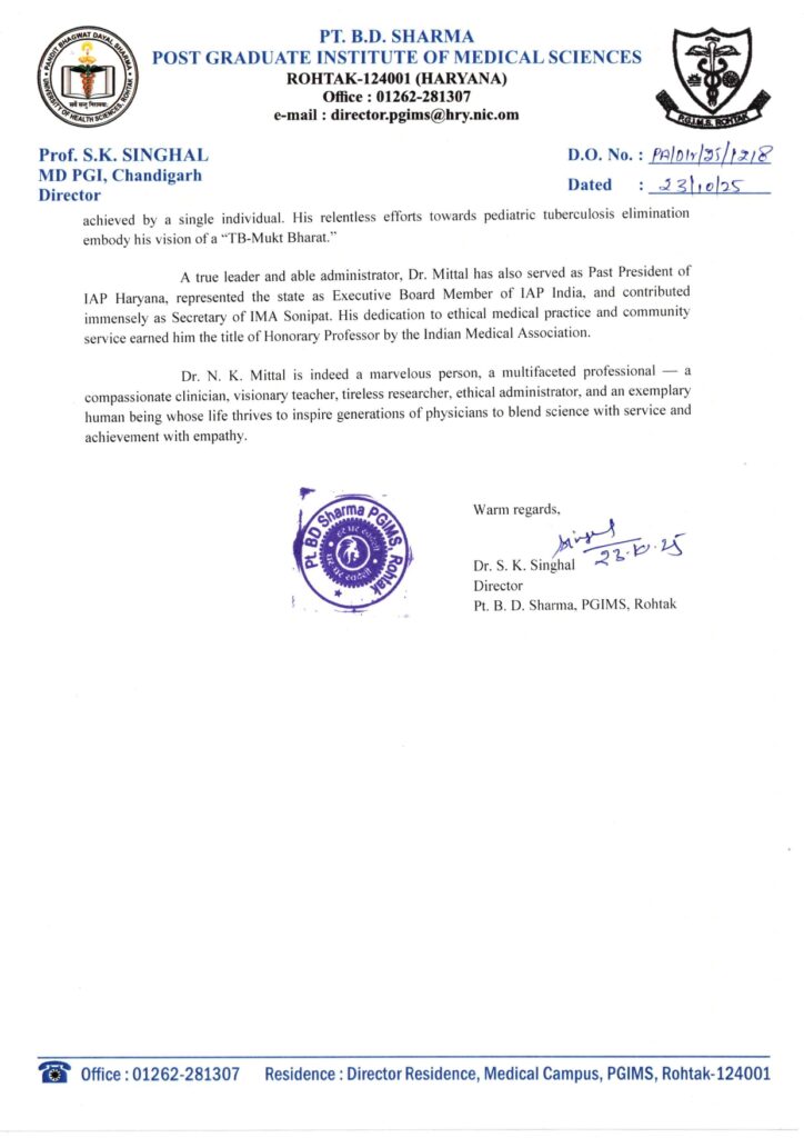 Prof. S.K. Singhal, Director of PGIMS Rohtak, strongly seconds Dr. N.K. Mittal’s nomination for the GAPIO Lifetime Achievement Award 2025–26. The letter praises Dr. Mittal’s four decades of outstanding service in pediatric TB care, neonatal ventilation, immunization, and public health. It highlights his ethical practice, humanitarian work, and leadership as IAP Haryana President and IMA Honorary Professor. Prof. Singhal commends Dr. Mittal’s charitable initiatives—free OPDs, immunization drives, and adoption of 1,200 TB patients—and describes him as a visionary teacher, compassionate clinician, and exemplary human being whose life blends science, service, and empathy.