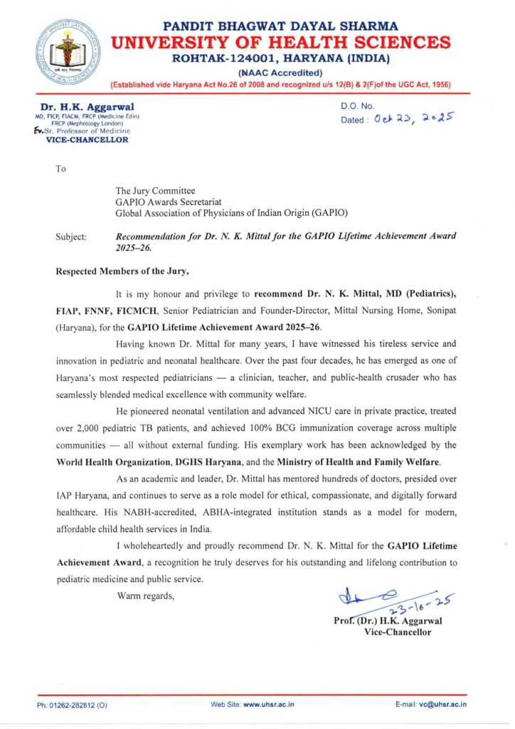 Prof. (Dr.) H.K. Aggarwal, Vice-Chancellor of UHS Rohtak, recommends Dr. N.K. Mittal for the GAPIO Lifetime Achievement Award 2025–26, praising his four decades of service in pediatrics, neonatal care, and TB elimination. He highlights Dr. Mittal’s pioneering role in neonatal ventilation, treatment of 2,000+ TB patients, and 100% BCG coverage without external aid. Appreciated by WHO, DGHS Haryana, and MOHFW, Dr. Mittal is lauded as an ethical leader, mentor, and innovator whose NABH and ABHA-accredited institution sets a model for modern, affordable child healthcare.